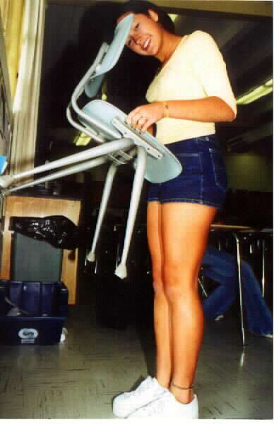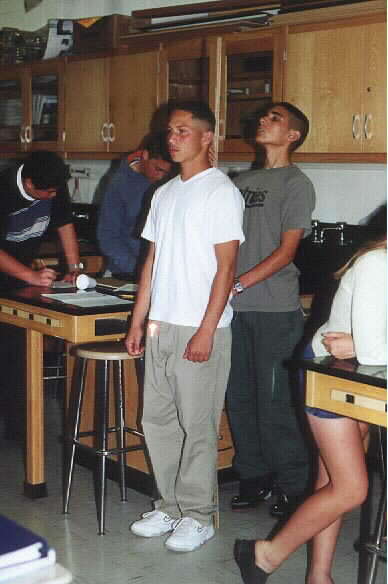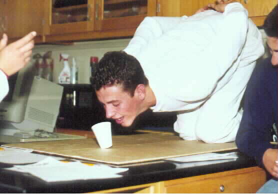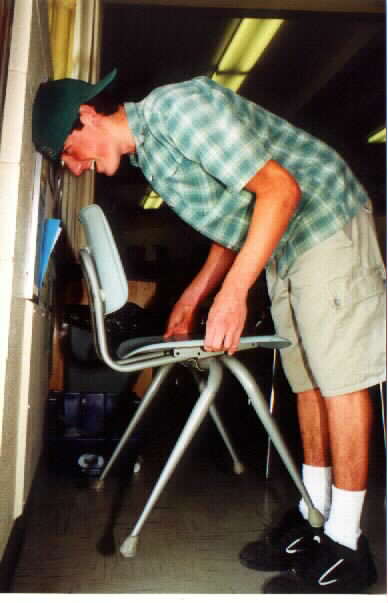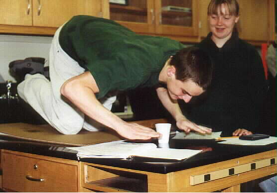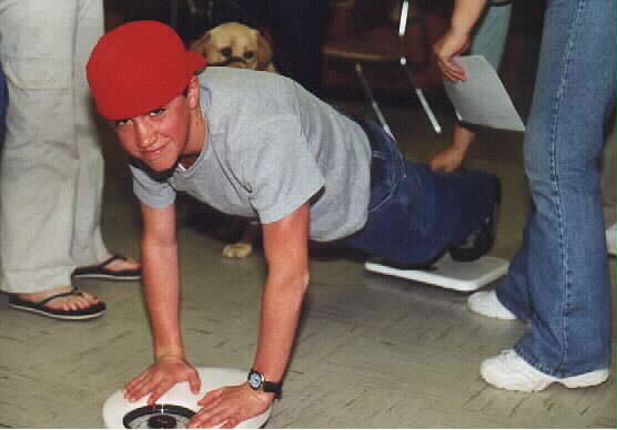 Paul showing proper push up form on the scales. (Miranda the guide dog in background) Kelly demonstrating how a male can't pick up a chair with his head against the wall. Lexi demonstrating that a female can easily accomplish this task. See, no problem... Tanner falls forward while attempting to tip over the cup from the "hunker down" position. Skipper the guide doggy shows canine form on the scales. Jamie catches himself before a painful collision with the lab table. Joe stands while Laren measures with accuracy. What good are data if they are not accurate? |