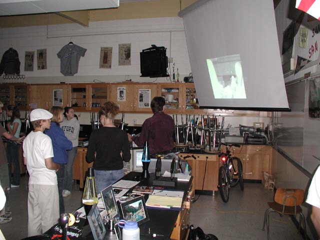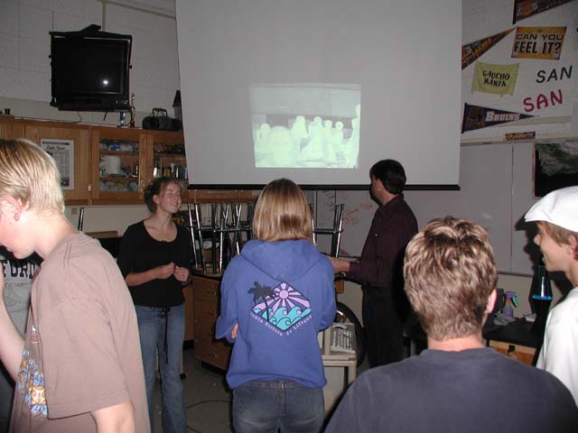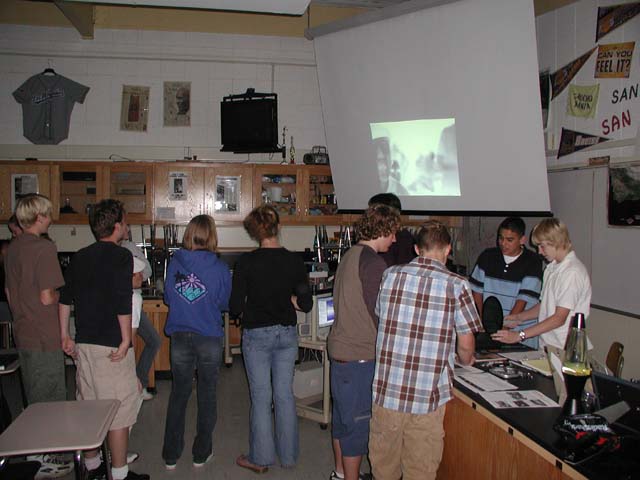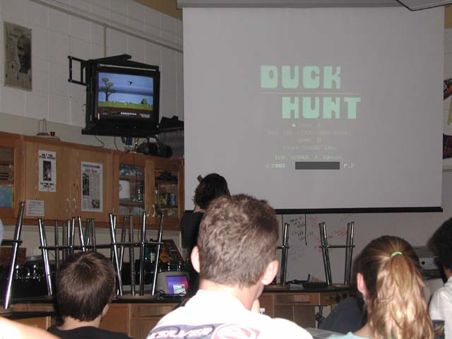 Adam completes his final project on the Nintendo Duck Hunt game and photodiode gun. His PowerPoint presentation is visible on the overhead screen and using Photoshop he has made his slides look like the actual game.