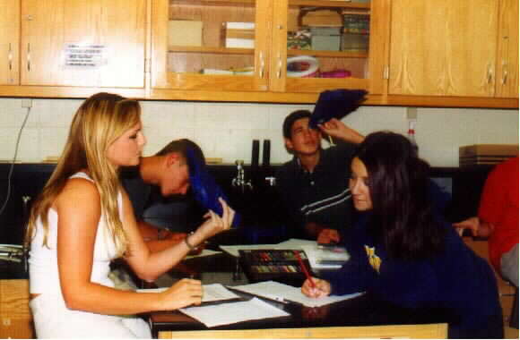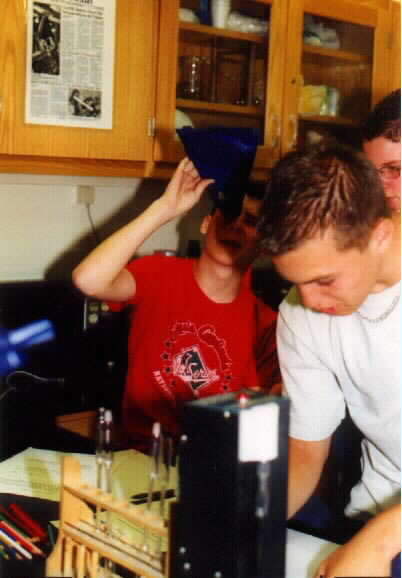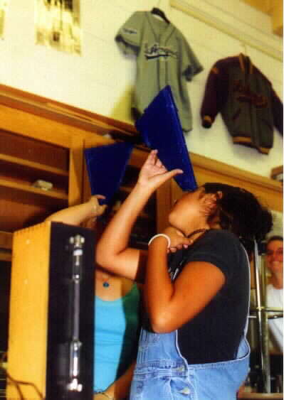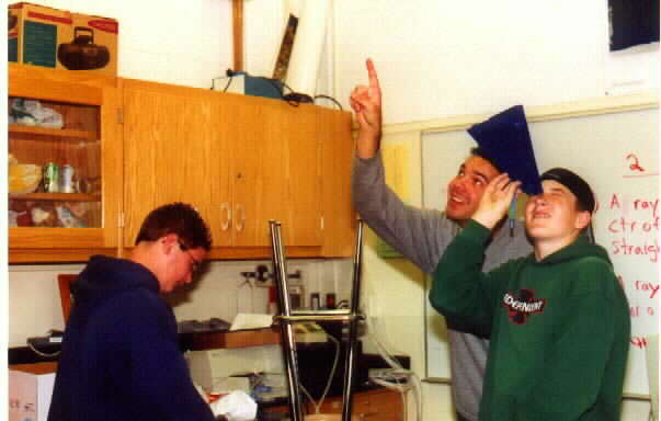 Nicole examines her spectroscope while Kenneth uses his to determine the spectra present in florescent light. Dan and Brian recording spectroscopic lines. Tasha strains to see the lines Mr. Bradley says exist (ok they are hard to see). Mr. B shows Lucas how to use the spectroscope (a rigged photo) |