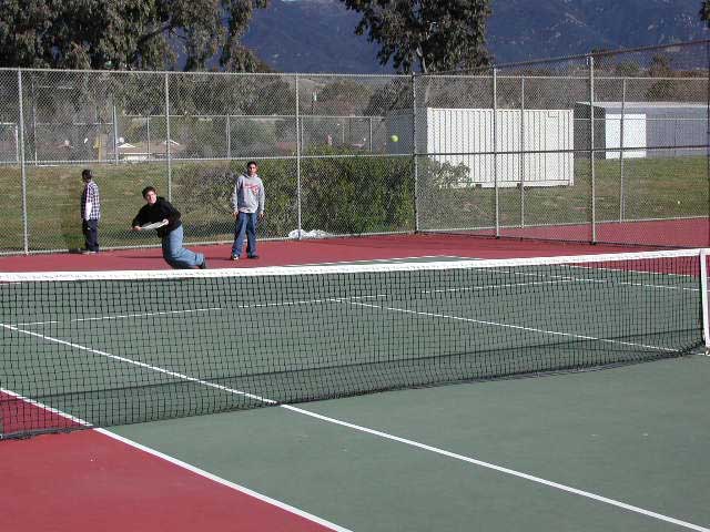 Sam serves from halfcourt while Alex shows off his latest FUBU fashion.
