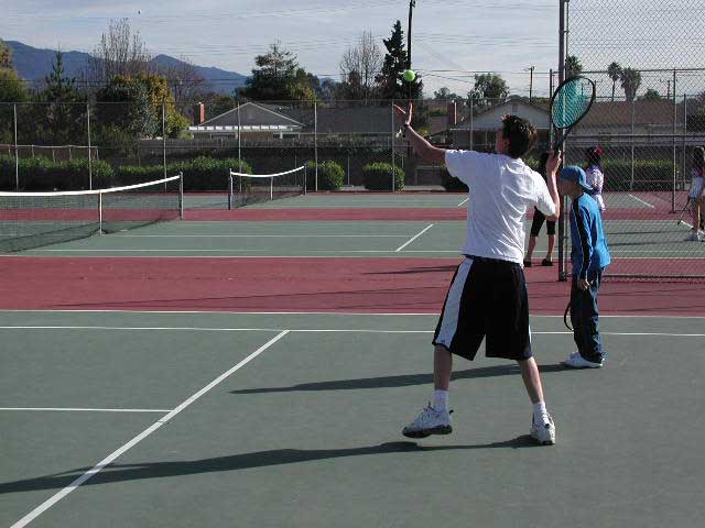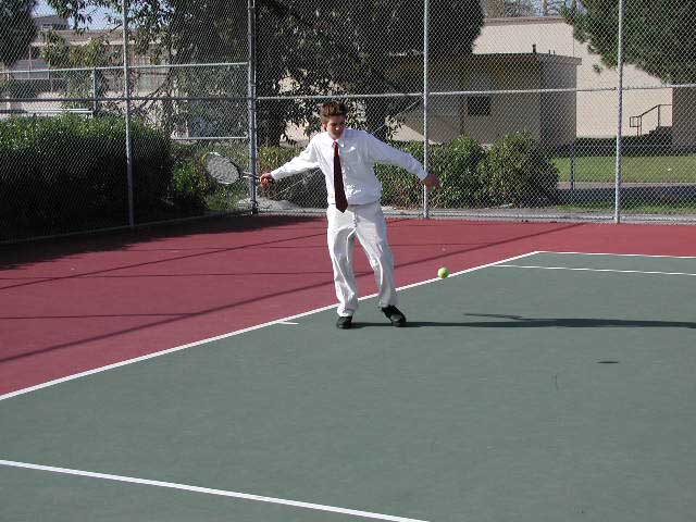Sean displays proper technique in hitting a forehand. Notice the eyes on the target and the extension of his lead arm. |